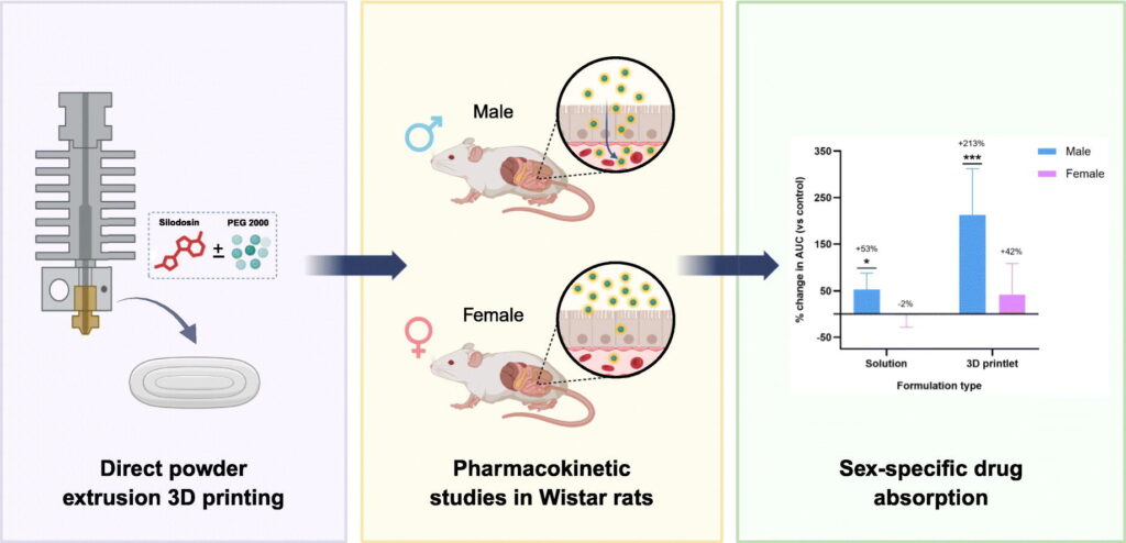 Using silodosin as a model drug, this study investigated polyethylene glycol (PEG 2000), an excipient known to interact with intestinal transporters. We found that PEG 2000 significantly increased drug exposure in male rats, while having little to no effect in females. When incorporated into 3D printed tablets (“printlets”) produce by direct powder extrusion (DPE), this led to striking sex difefrences, resulting in a 213% (more than three-fold) increase in drug exposure in males, but not in females.