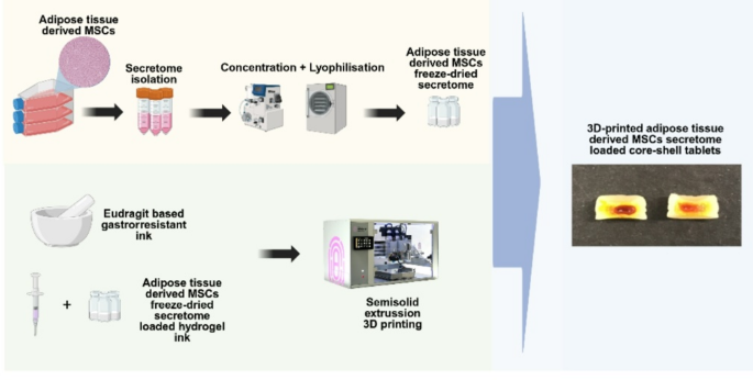 To address this, we developed a 3D-printed core–shell tablet for oral delivery of adipose-derived MSC secretome. The secretome was freeze-dried and incorporated into an alginate hydrogel core, surrounded by a gastro-resistant Eudragit shell produced using semi-solid extrusion 3D printing. This design protects the proteins in gastric conditions and enables their release in the intestine.
